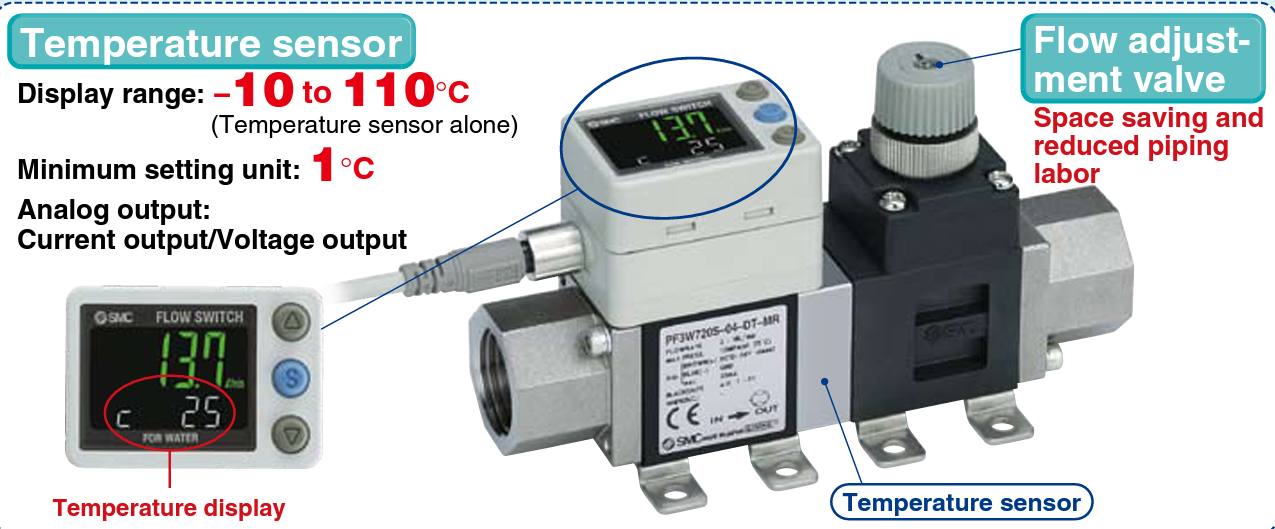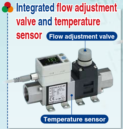 - Integrated flow adjustment valve and temperature sensor